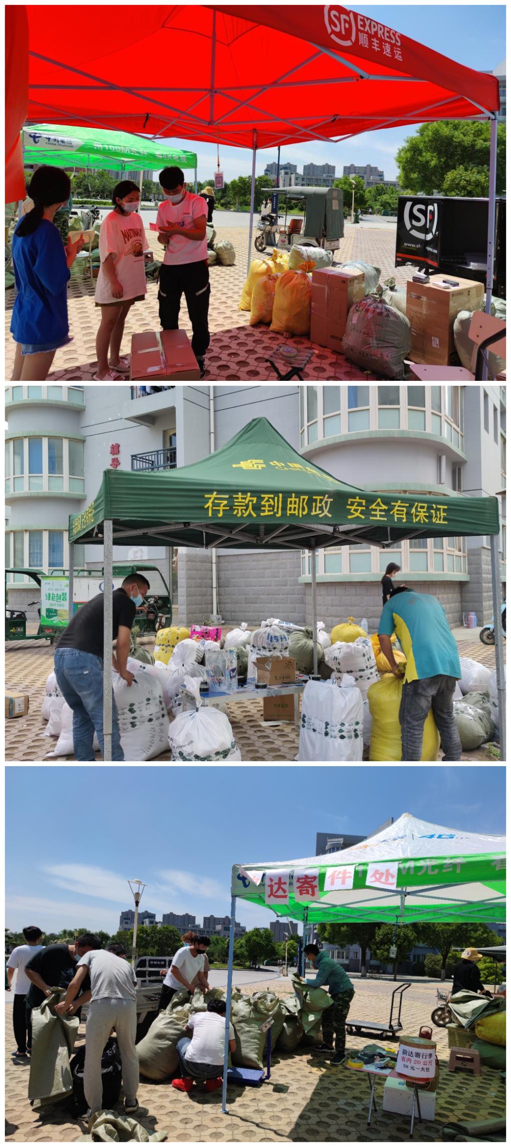 5月19日上午,资产经营管理中心在学生宿舍楼前的扬帆广场分别设立了六个行李邮寄服务点,邮寄服务点设立时间为期四天,并公布校园快递监督电话,确保全力做好学生们的行李邮寄工作,共同创建文明、有序、安全、温馨的离校氛围。(供图:资产经营管理中心)
